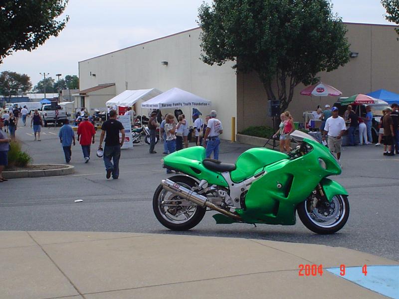 candy lime green paint, tons of chrome, extended swing arm, all aftermarket lights, full yoshi exhaust,