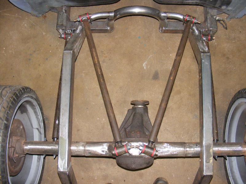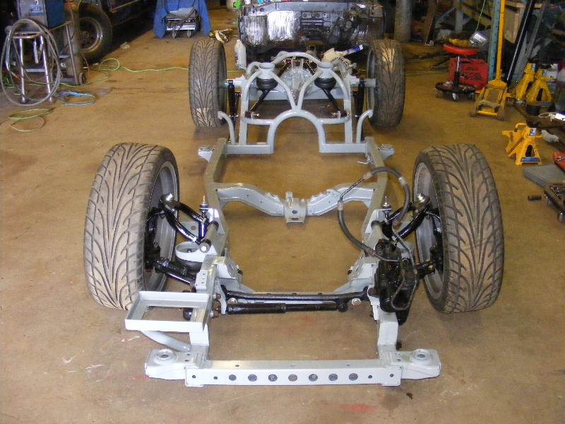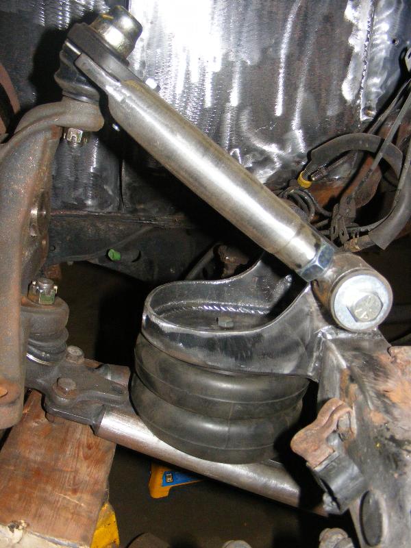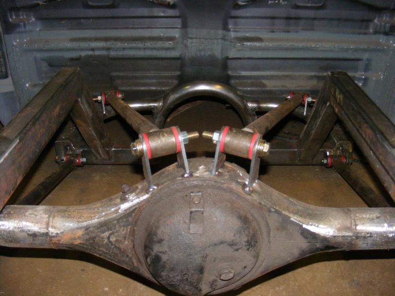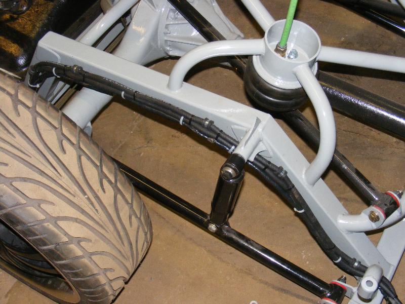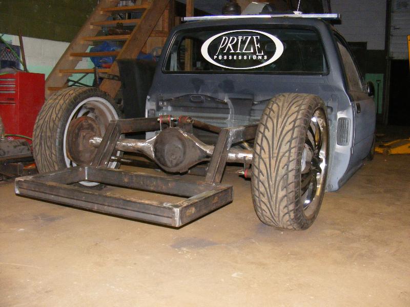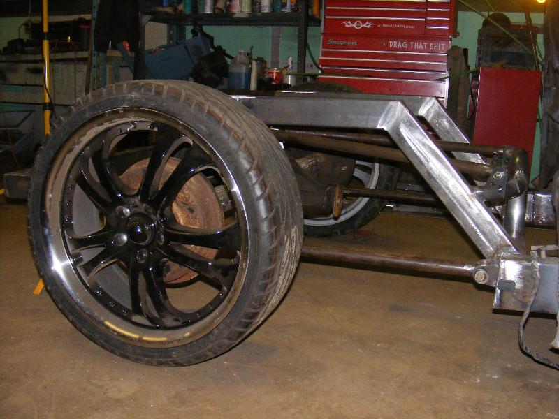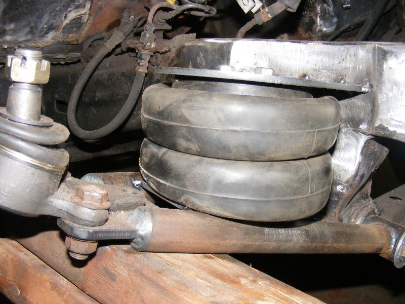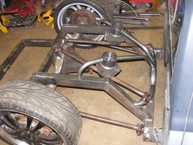 bags...tubular uppers and lower control arms...custom back half also used as air storage...cusom made 4-link...bags on upper bars...frame smoothed, sandblasted, and painted