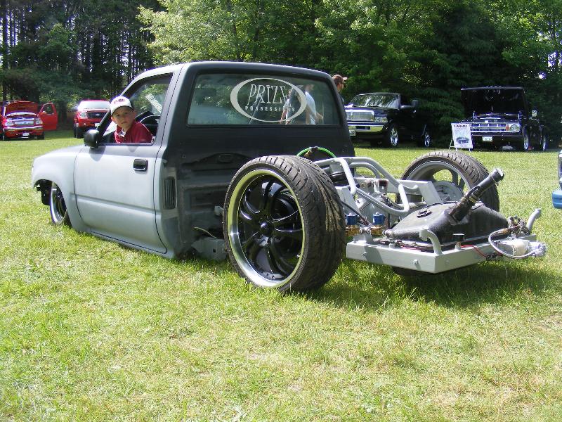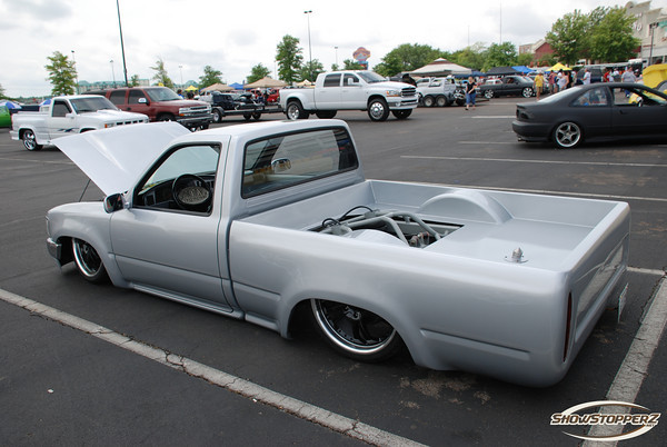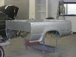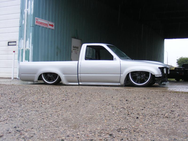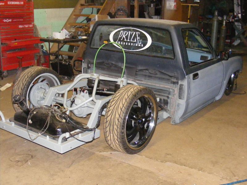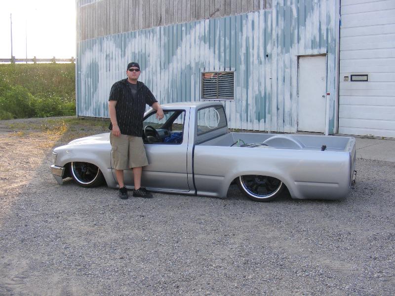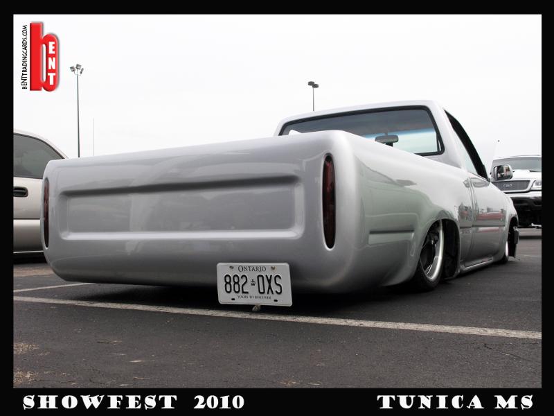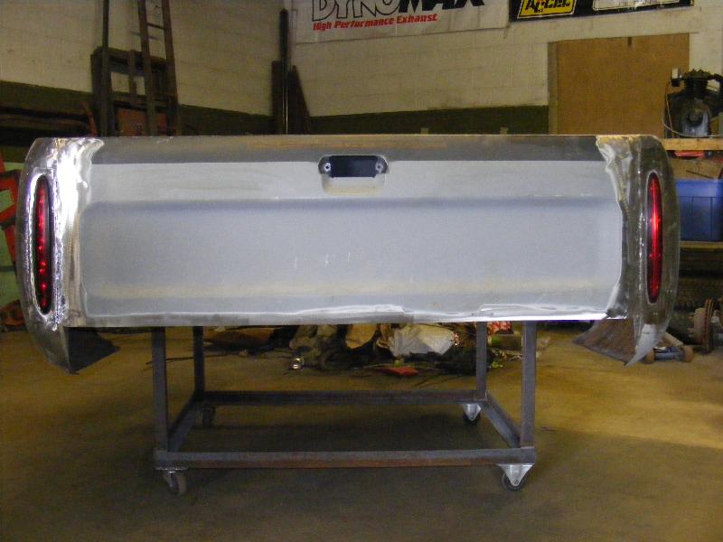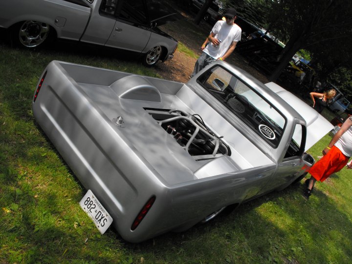 shaved firewall, antenna, handles, gas door, rock guards, full sheetmetal bed, molded stock tailgate , custom tail lights, hand made roll pan....
