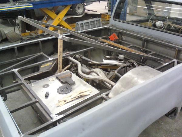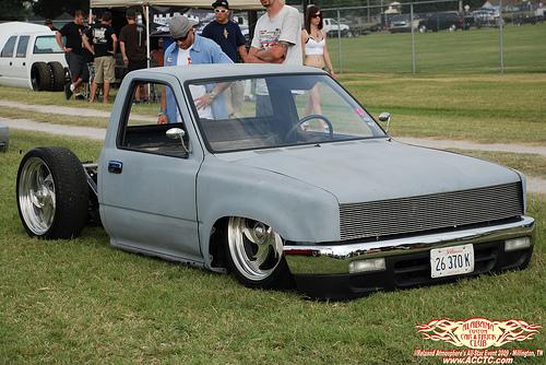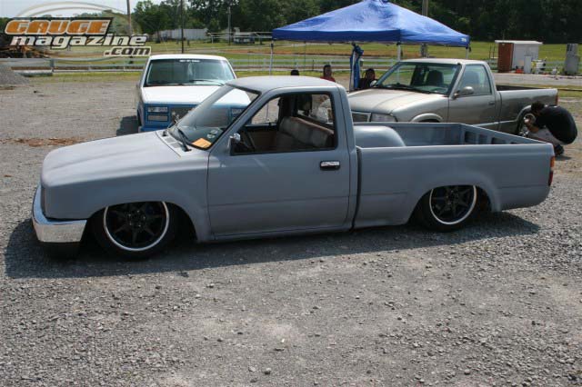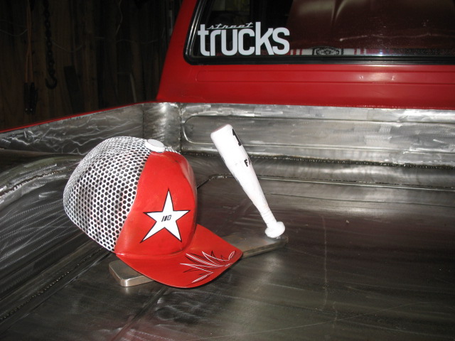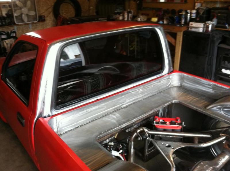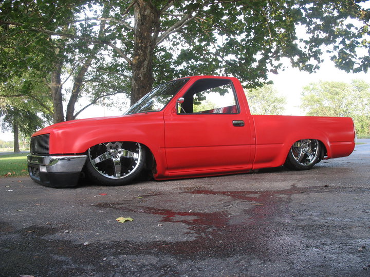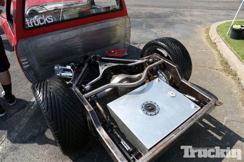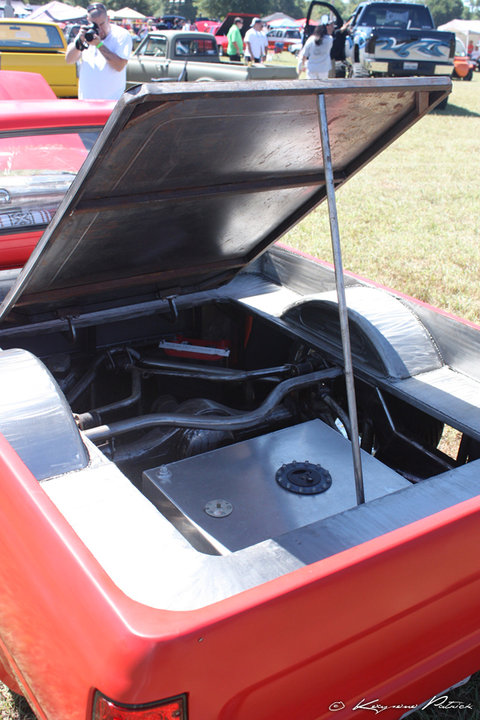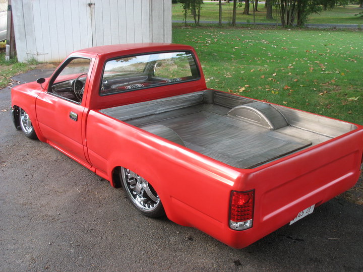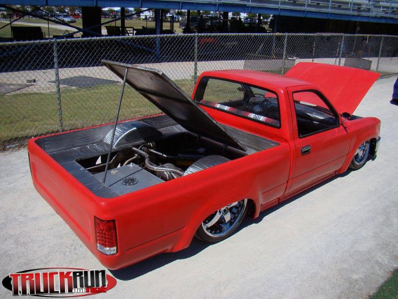 Shaved side markers,gas door, hood squirter's,and fire wall and rear cab wall. Billet Phantom grill and shaved 4 runner bumper sectioned and sucked back two inches. 4-runner rear roll down back glass Oem tailgate skin molded into the rollpan and bed. Completely new sheetmetal bed floor with wood access door to show off suspension