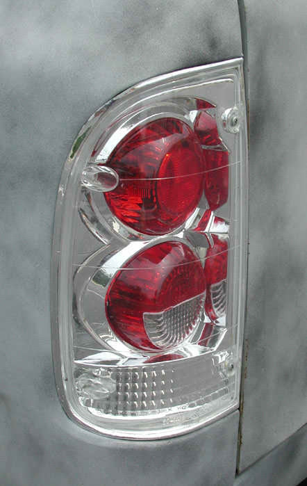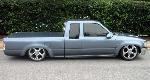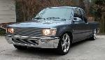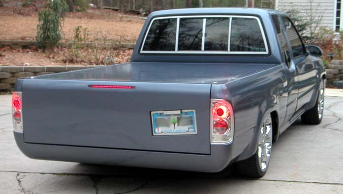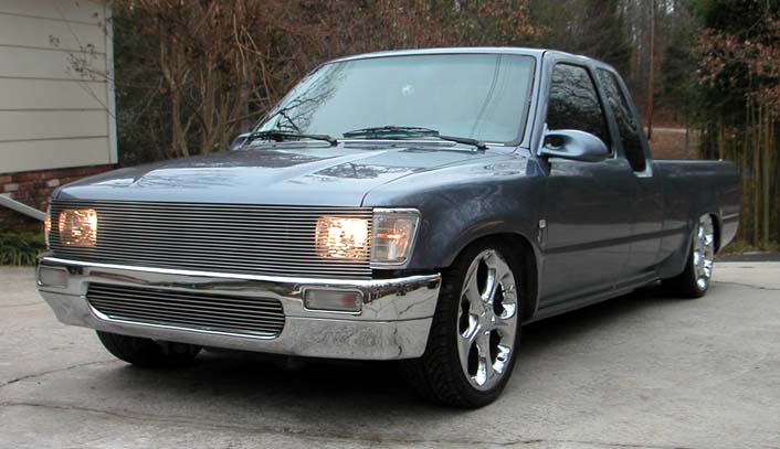 Phantom grille with diamond back headlights behind it. 4x4 fenders with clear lenses, side markers. Chrome bumper/valence with billet insert. Celica mirrors. Tinted windows. Tacoma Altezza tail-lites molded in. LED 3rd Brake light. Tailgate skin with angled plate box. Rollpan. Shaved doors, antenna hole, gas door lock, rock guards. Sunroof. BMW Steel Blue Metallic paint!