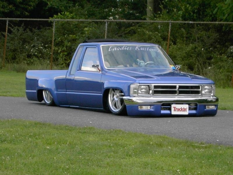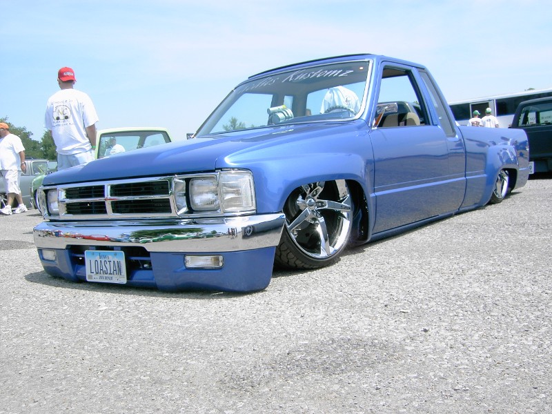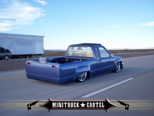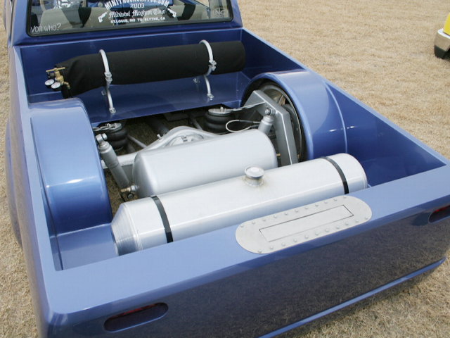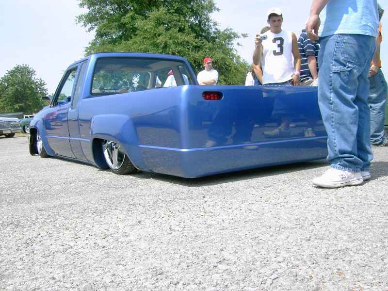 3"Bodydrop. 88 4wd chrome grille. 4wd Fenders. 97 4wd Tocoma bumper and valance. Clear corners. Stock hood,no supports cut. No motor drop. Shaved hood squirter, wipercowl, antenna, gas door, doorhandles, locks, taillights, body seams, rear corner bodyline. Rear Combo Skin.Graft 4wd front fenders to bedsides. French LED trailer taillight. Popup license box{air}. 40x30 ragtop. Harley billet mirror with blinker. MAS Racing Products 14 gallon spun aluminum fuel cell.