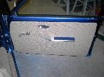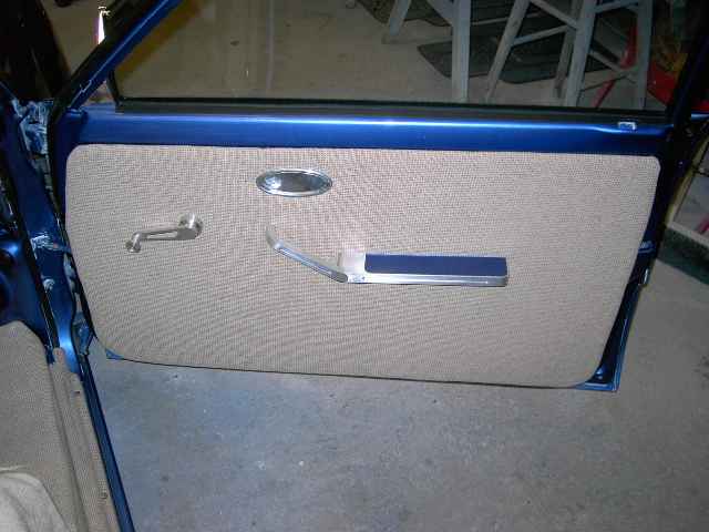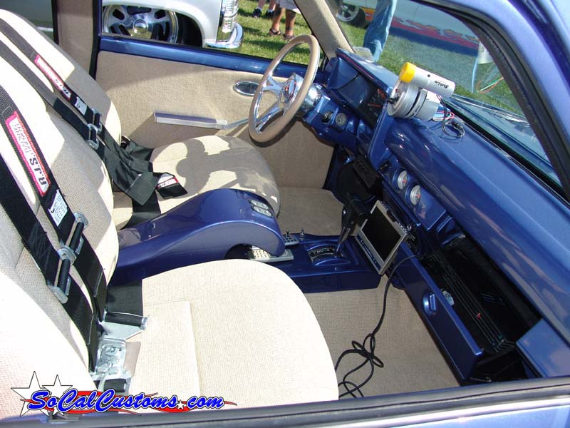 Molded air gauge pods in dash,painted. Custom fiberglass centerconsole. Custom kickpanel. Billet door handles, armrest, window cranks, ragtop crank. Billet Specialties steering wheel. Tan Tweed. AutoMeter gauges.