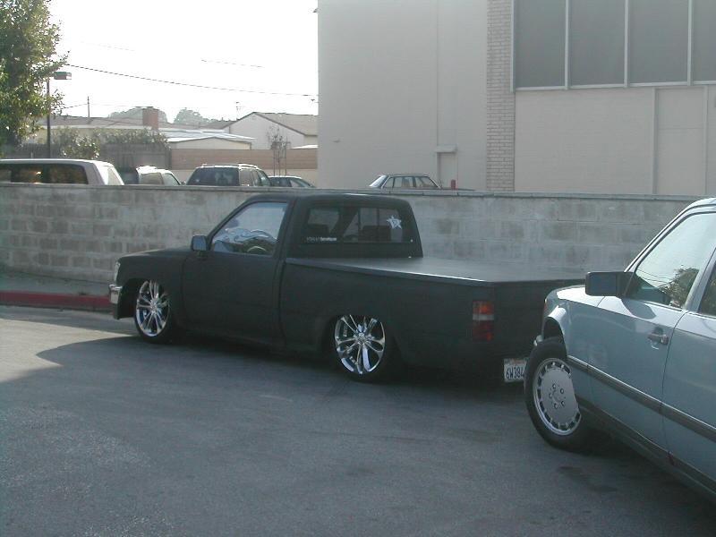 full 95 4runner front, clear corner and bumper lights, 4x4 fenders, shaved rocker holes, antenna, door handles, tailgate handle, 3rd brake light, hood pissers, welding in and molded rollpan, custom license plate, gaylords bed cover. 5% window tint with mirror flames (but changing the design..this was just a practice tint)