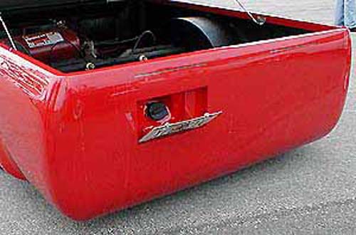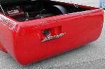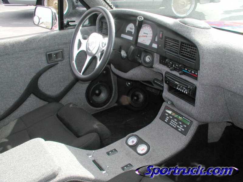 Toyota Super Red paint, graphics on hood, cowl and tonneau cover, shaved:hood squirters, antenna, wipers, rock guards, tail lights, tailgate, door handles and gas door. suicide doors, l.e.d. tail lights, flip down tag in the tailgate skin with the new gas door behind it, sliding ragtop, fiberglass tonneau cover, 4x4 fenders and all chrome 4x4 bumper, valance and grille with billet insert