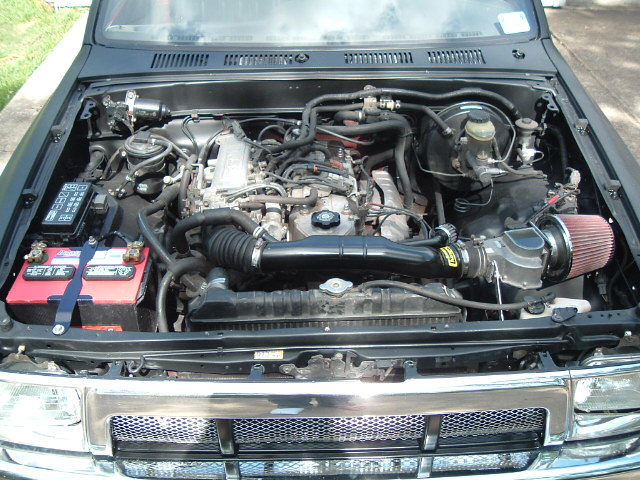 22RE 4-cylinder with homebuilt intake, battery hold down, and cat-back exhaust with glasspack.