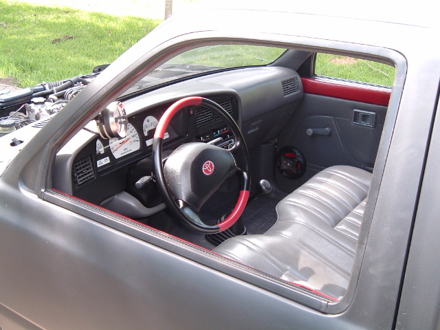 "Synthetic gray leather", whiteface glow gauges, 3-1/2" sunpro super-slim tach. Some dash parts painted.