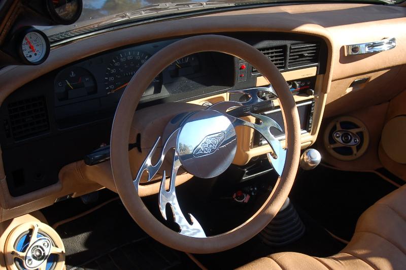 Stock bench seat reupholstered with removed headrests, carpet replaced and sound deadened, door panels reupholstered with fiberglass speaker pods, dash upholstered, BAD Carnage steering wheel with matching interior wrap, custom cantilevered clutch master cylinder beneath dash, LC Engineering shift knob and short shift kit, floorpan modified for driveshaft clearance, firewall tubbed for wheel clearance, custom molded fiberglass kickpanels, headliner and sunvisors upholstered to match, custom fiberglass rear speaker pods, Billet Specialties window cranks, grab handle, and courtesy lights