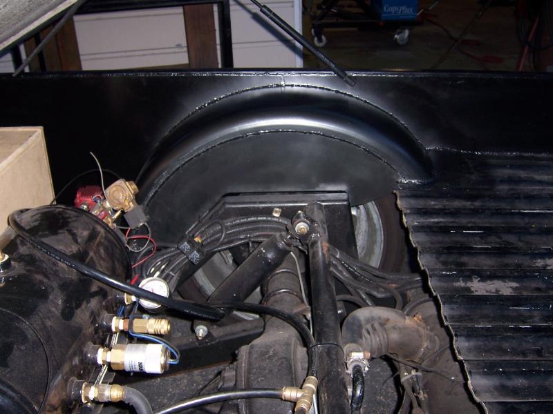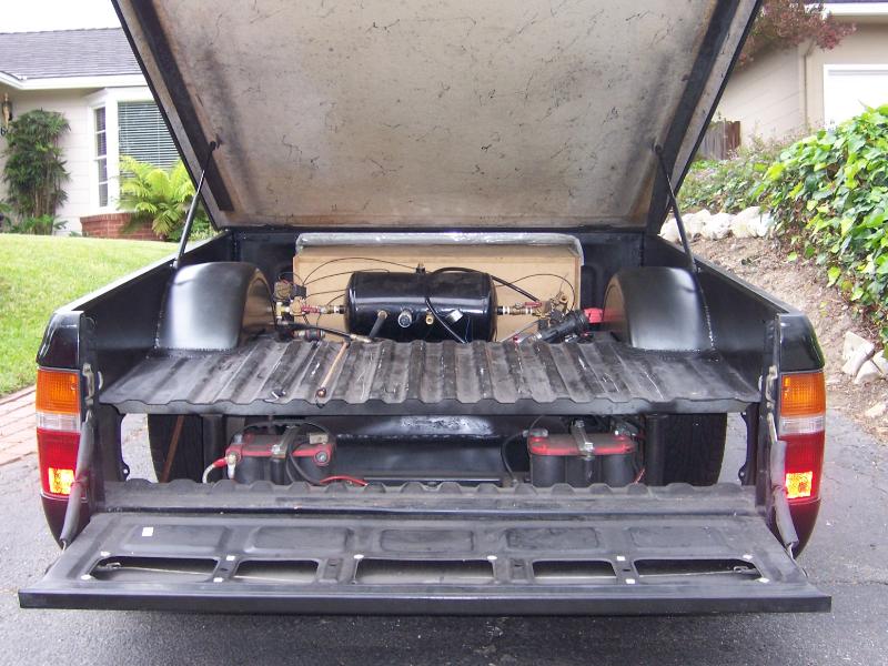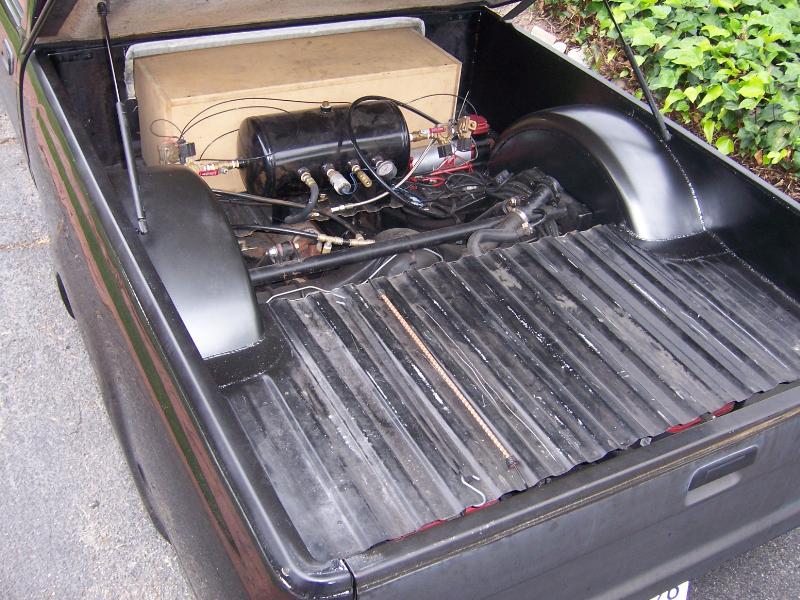 Slam Specialties RE6front bags, DJM front shocks, custom front bag mounts, frame z’d in front 1 ½”, Belltech drop spindles, modified upper control arms, custom bolt in transmission x-member, custom rear frame clip from cab back using 2X3 ¼ wall tubing, relocated gas tank, custom dual Optima battery rack, class 3 style hitch, custom 2 link setup with heimed diagonal panhard bar, Slam Specialties rear bags, DJM rear shocks, 5 gallon air tank (dual 2 gallon frame mounted tanks shortly), SMC valves (Slam Specialties DSV dual speed valve setup installed, not yet plumbed), slowdowns on lift valves,Firestone dual needle air gauges mounted on A-pillar, AZ compressor, engine driven compressor