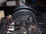 Stock 2.4L 22RE, Custom Garrett GT25R turbo setup, TiAL blow-off, AEM F/IC,intercooled, custom intake, relocated wire harnesses and items over inner fenders, inner fenders removed completely, clutch master cylinder relocated beneath dash, relocated Optima battery (yellow top), fully TIG welded Magnaflow exhaust, relocated gas tank beneath bed, Clutch Specialties Stage 1 clutch disc/pressure plate, DOA Racing timing chain with metal guides, Garrett boost gauge