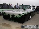 Hand-fabricated steel dash and center console painted to match the exterior. Seats are out of a '96 Honda Prelude sans headrests with modified seat mounts and wrapped in black pleather. Additionally, the door panels are pleather-wrapped Masonite with inserts that make the door panels flow into the dash. See the killer steering wheel in the truck? You can't buy it. It was built from a barstool "borrowed" from Josh's parent's house. The center is a piece of plate steel. Once combined and made to fit a stock wheel, the wheel is held to the column via the factory hub nut. The rear frame clip is tied to the in-cab roll cage, a la race truck style, and painted to match the green tribal found all over the truck. The center console is also of Josh's own design, made to flow to the dash, as well as to house the truck's wiring and stereo components.