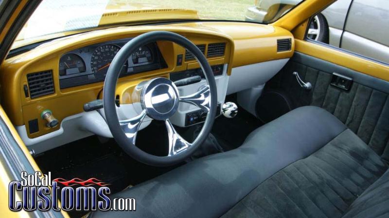 Lower dash fiberglassed, stock bench cut down, pleated, faux leather and suede, suede headliner/back wall/B pillars, marble shift knob.