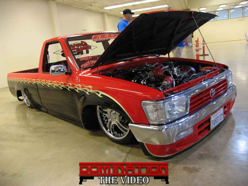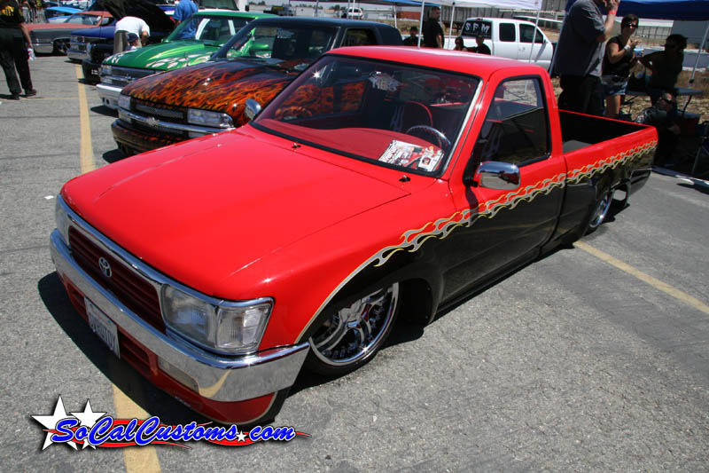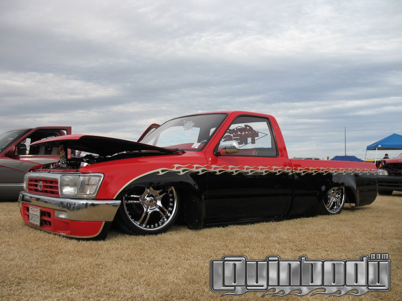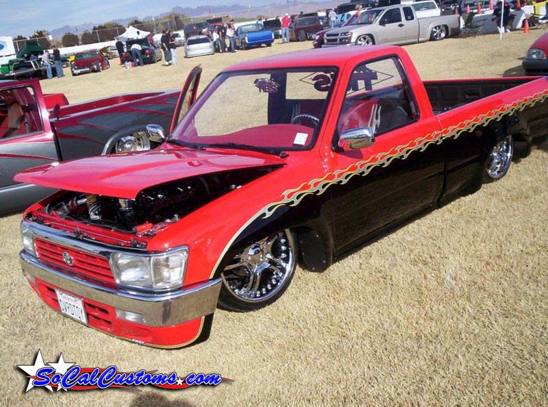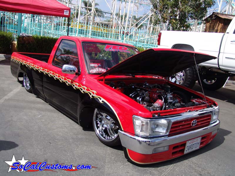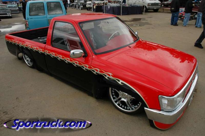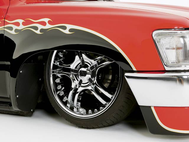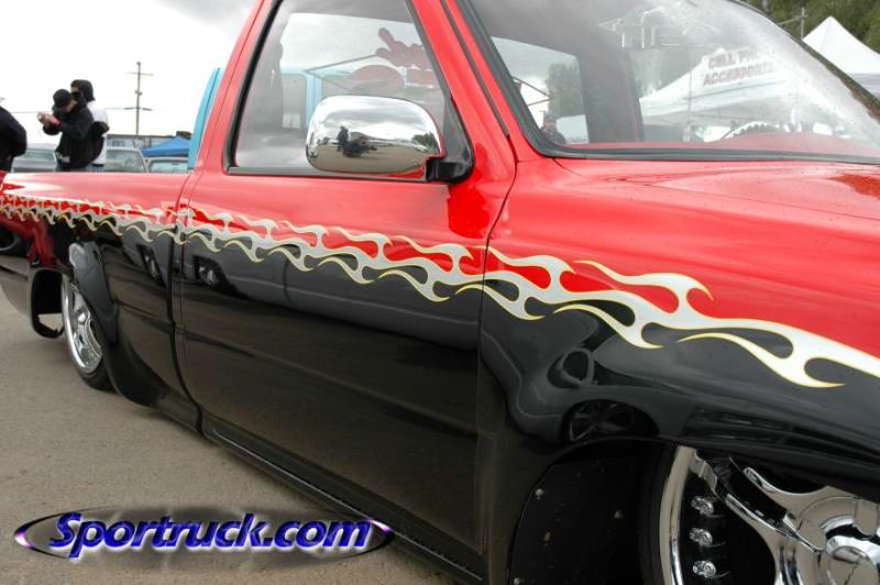 Before flames continue down the side of the truck, it starts out as a straight line all along the bottom of a Toyota 4 Runner valance and skips over a chrome and red 4 runner front-end and onto Toyota 4x4 fenders.