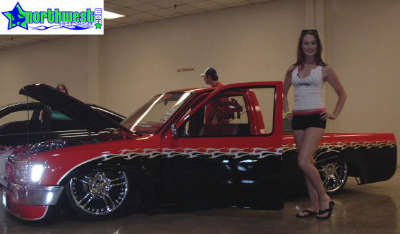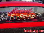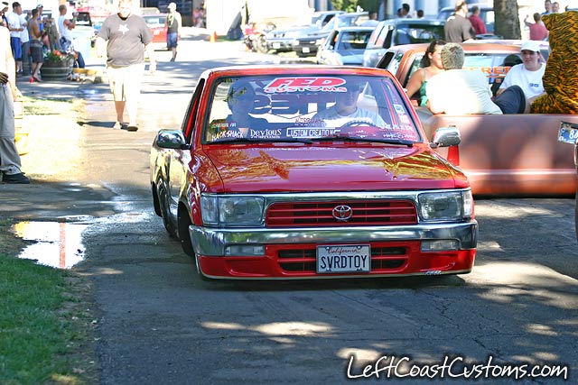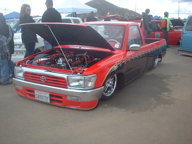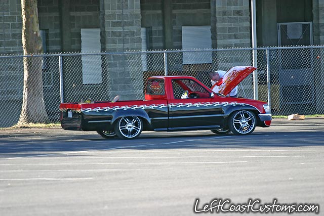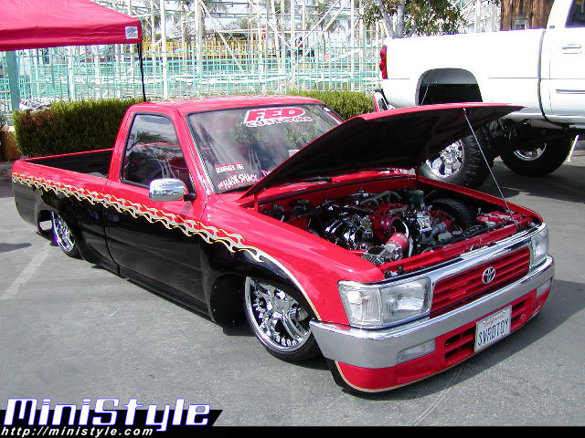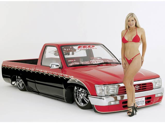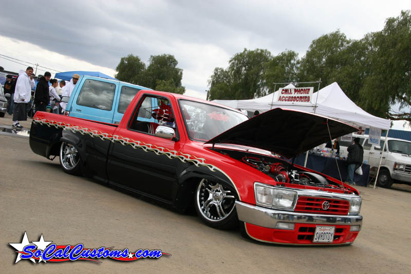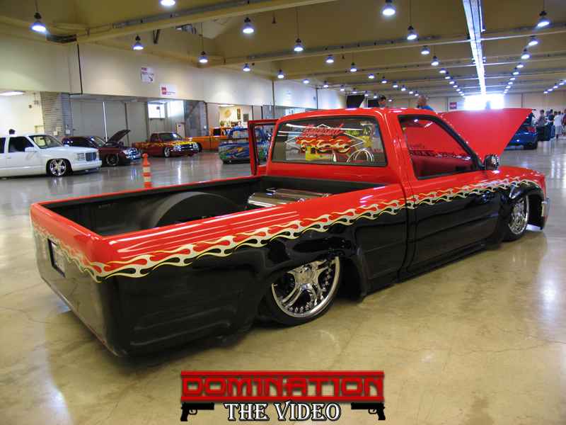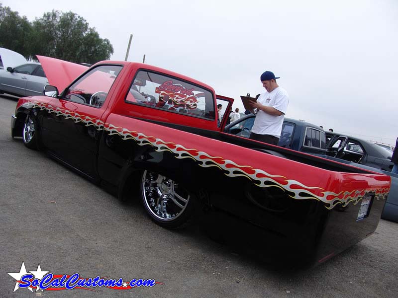 Before flames continue down the side of the truck, it starts out as a straight line all along the bottom of a Toyota 4 Runner valance and skips over a chrome and red 4 runner front-end and onto Toyota 4x4 fenders.