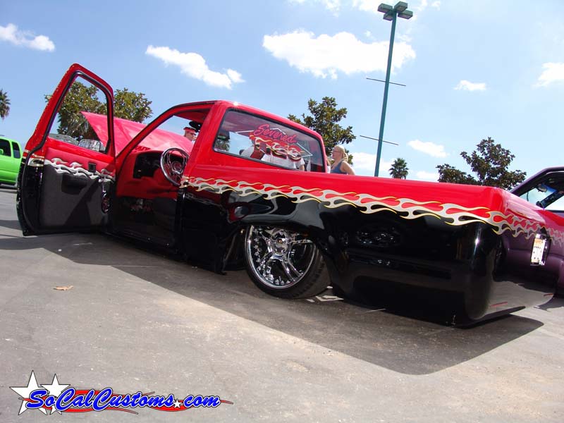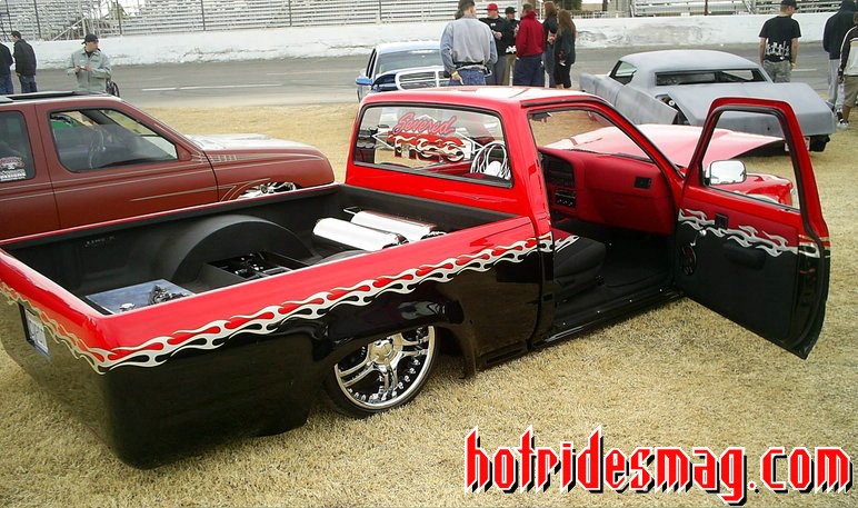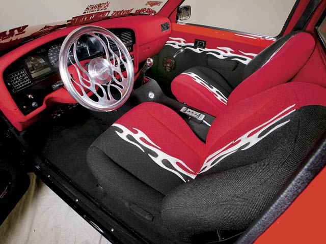 Finish bodywork and paint performed by Ed Warren (Fast Eddie) of FED Customs in Yucca Valley, Ca. Ed painted the truck to match my logo with Spies Hecker Permacon 2002 Audi Lazer-Rot Red and midnight Black two-tone with a metallic silver flame outlined in bright yellow that divides the red and black. Dupont cleared, color sanded and buffed to perfection.