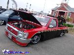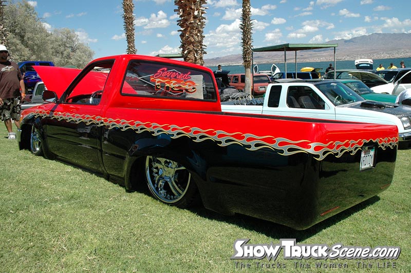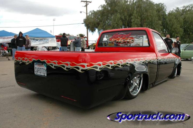The body has been shaved of; door handles, bed rock guards, windshield squirters, cowel vents, antenna hole on fender, 3rd brake light, tailgate handle, tailgate bodyline, tail lights, and gas door. I added a roll pan with LEDs and welded the tailgate shut. I also added a frenced box to the tailgate to hold the license plate. I did most of the bodywork, but had some help from my brother Kevin, Robert Ardy (Browneye), and Ben May (Benji).