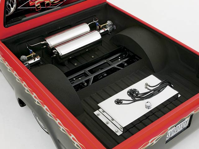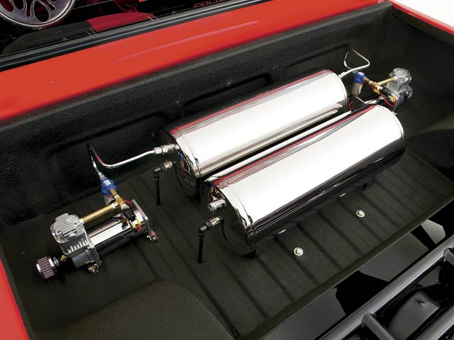4 corner Firestone airbagged suspension by FED Customs in Yucca Valley, Ca. Bag job includes; 2 Viair 380 chrome compressors, 2 ARO air solenoids, 2 Hack Shack chrome air tanks, and 3/8 double walled Furon airline. 3/8 O.D. chrome hardlines run from the compressors to the air tanks in the bed.