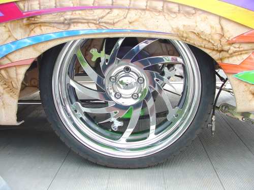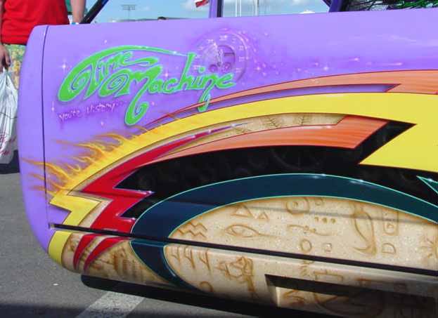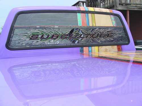 Fully shaved, Custom l.e.d. tail lights Hidden in the graphics, semiphores(turnsignals in the b-pillars), custom mirrors. Custom graphics. "graphic excavation" on the tonnue cover. Custom stained glass rear window. SPECIAL THANKS TO BRAD HOUK FOR HIS WORK ON THE BODY & SUSPENSION.