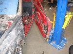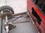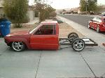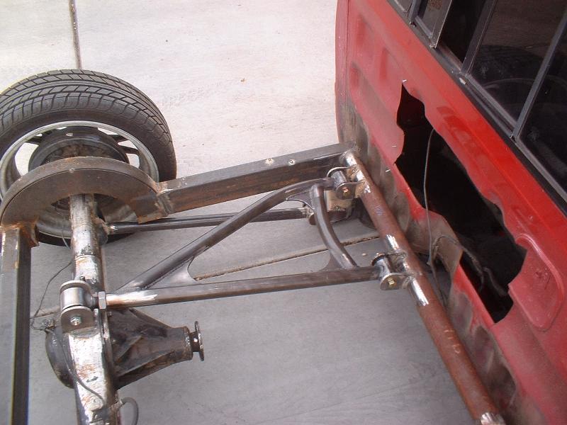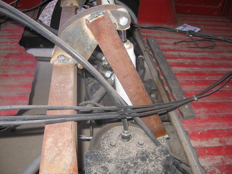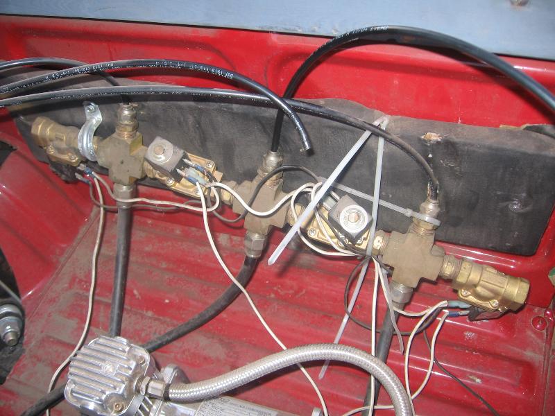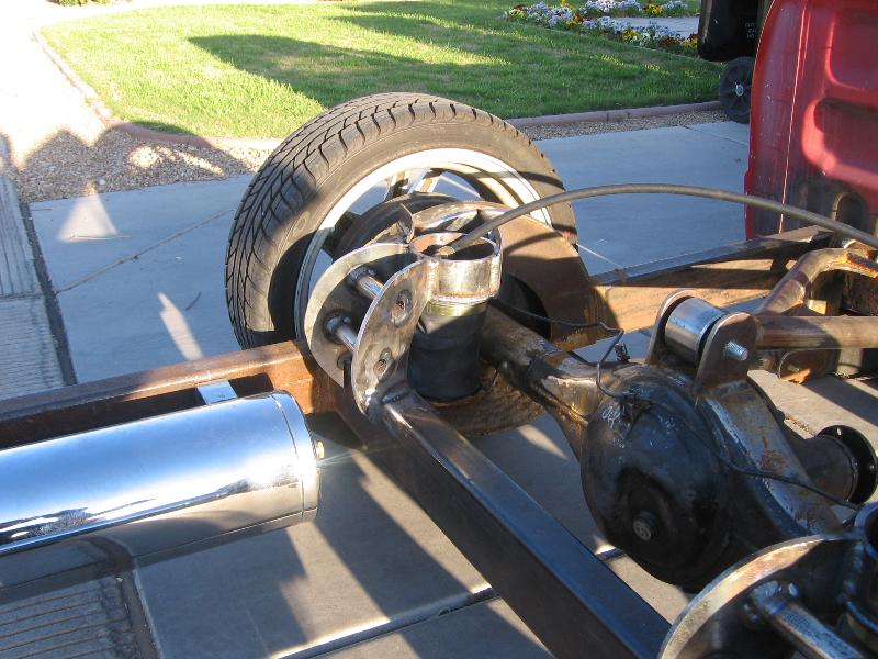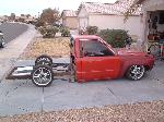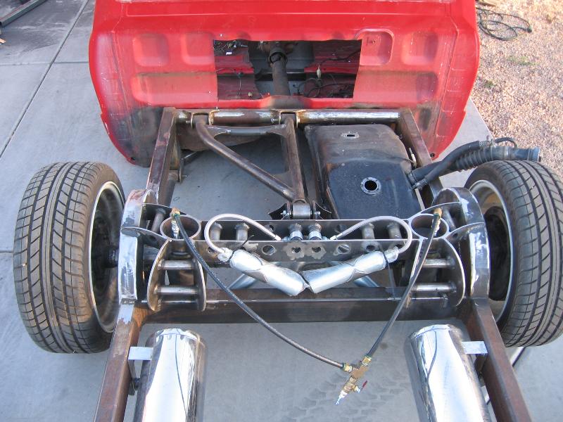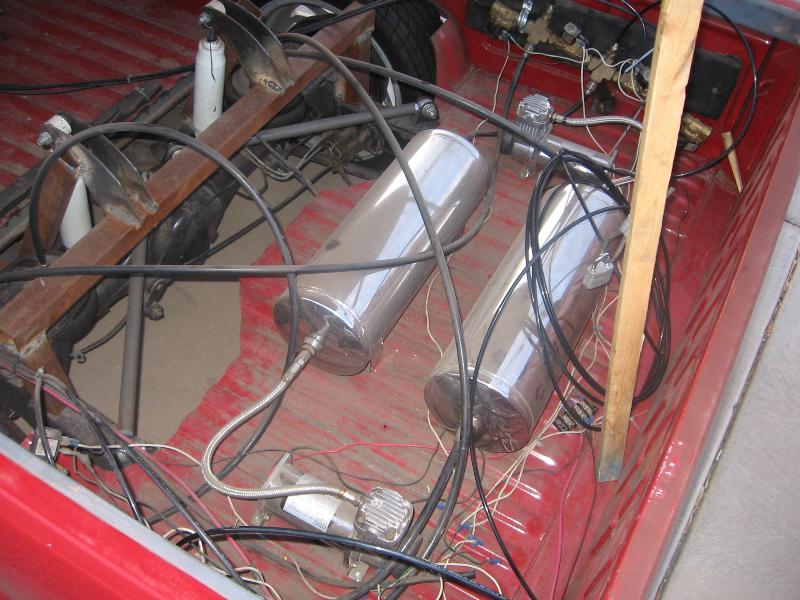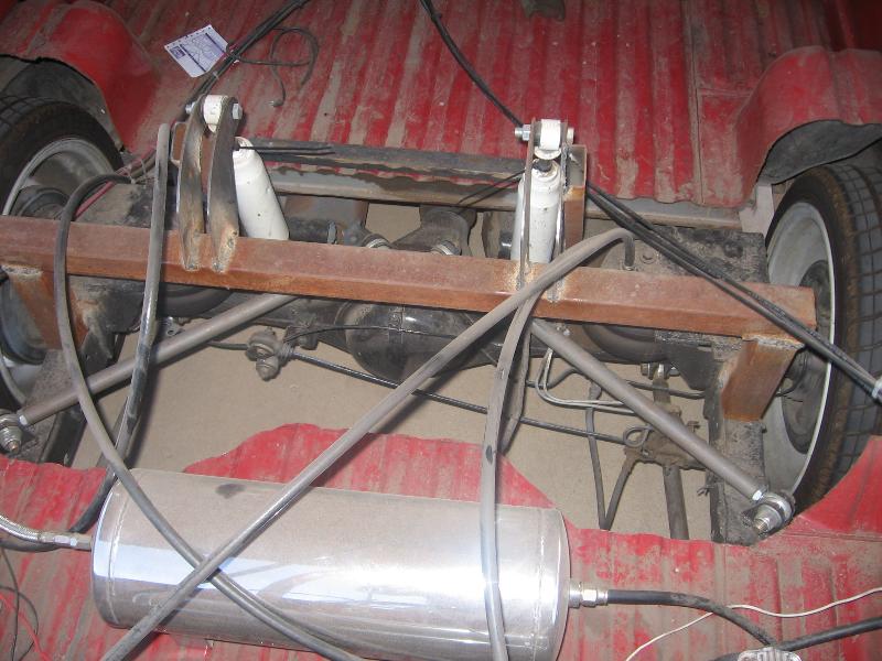 stock floored till the rockers hit the ground, slam bags up front, arrnot air sleeves out back. custom three link, stock gas tank, double frame rails iunder the cab, custom rear clip. Pro comp res shocks all the way around, Two three gallon tanks, still need compressors.