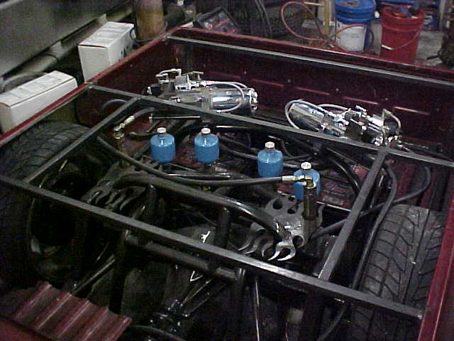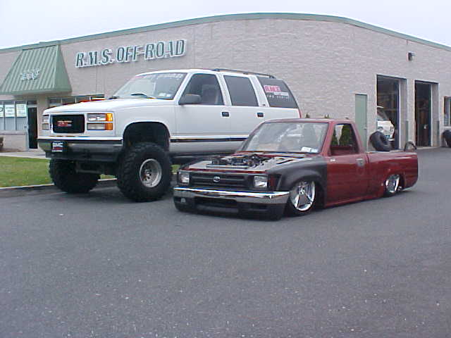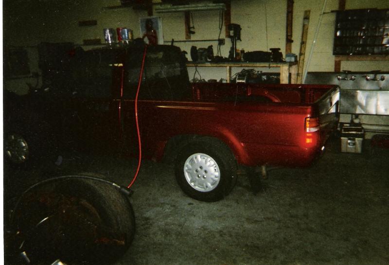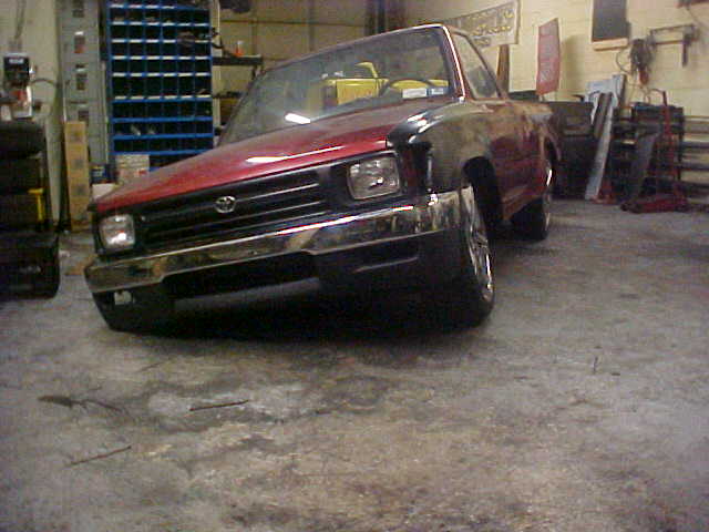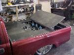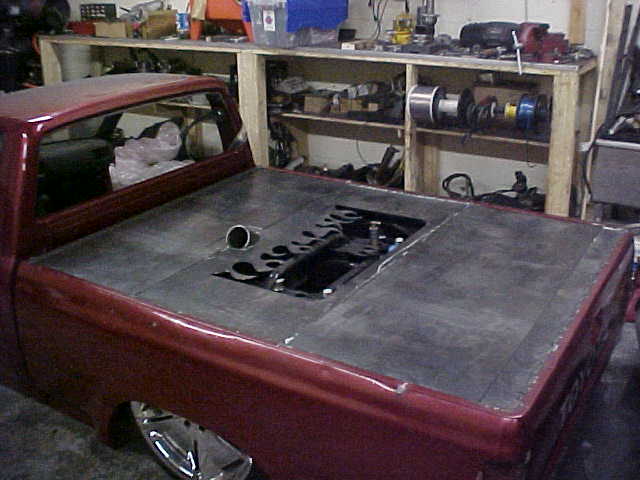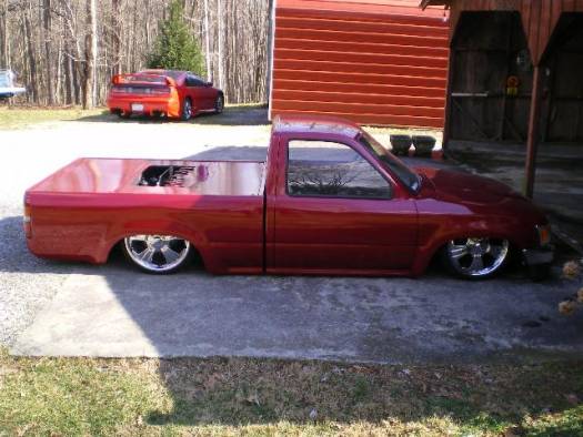 shaved everything,molded cowl into fenders and fenders into rockers,taco front bumper,stock 4x4 fenders,custom sheet metal bed cover with two trunks,box n tube sub frame,tranny crossmember,body dropped n lower'd cab mounts,(b-drop+20's+heat in the north east=cool)