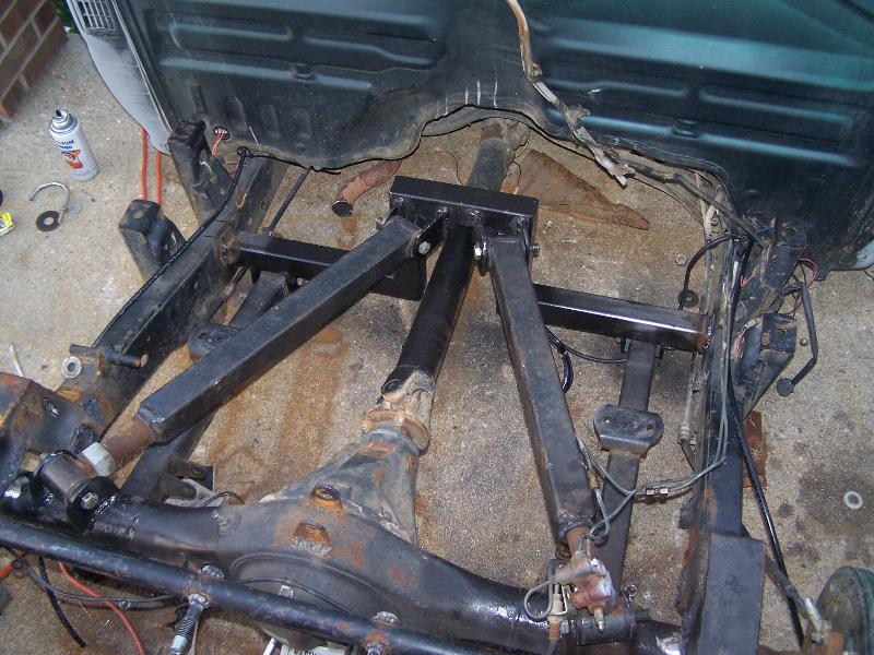fliped ball joints, viar 480, 2500 bags on front 2600s on back, triangular 4 link with bags mounted bottom bars. has a lot of lift. now draging transmission mount.remounted shocks and sway bar.