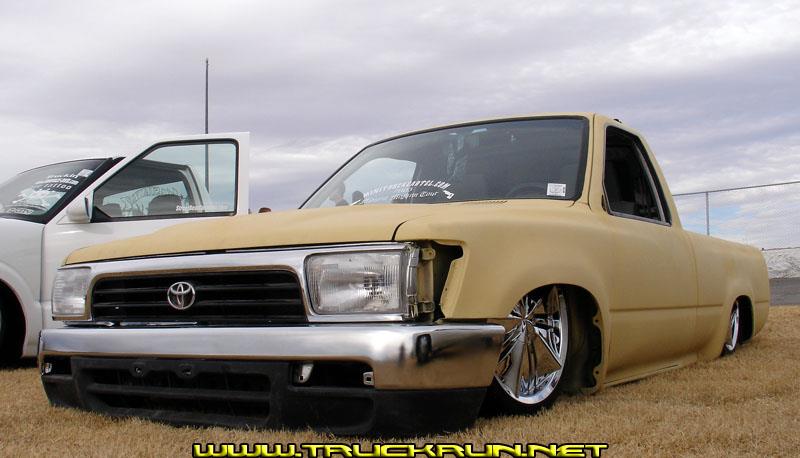shaved door handles, hood squirters, cowl, antenna, tailgate handle and skin, taillights, rollpan, gas door, '94 4-Runner front end (bumper, lights & grill), tan primer, ragtop, four 10 inch leds in tailgate, custom mounted license plate