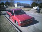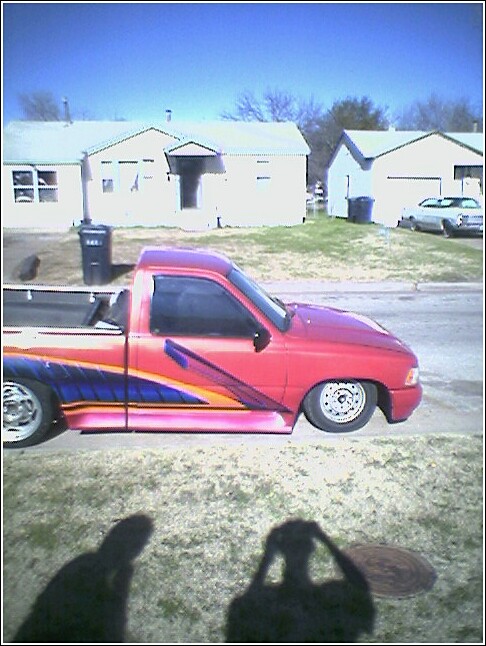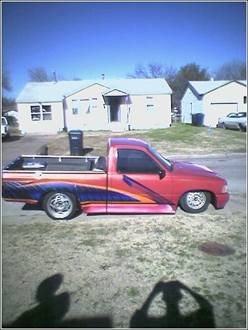 shaved everything, door handles, tailgate, and antenna......red/orange paint with gold flake, blueish graphics...hard to describe, and a body kit on the cab and front of the bed