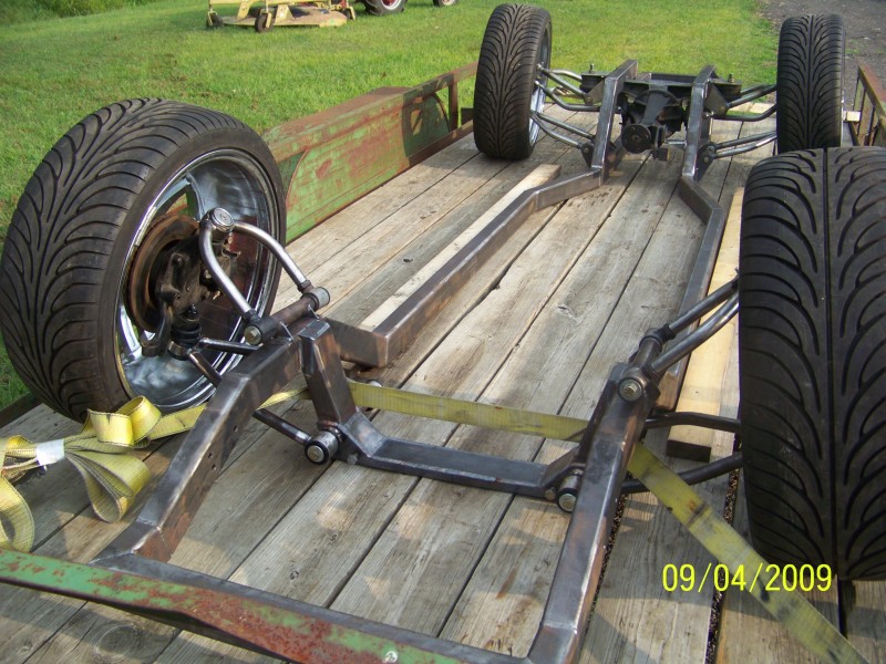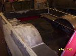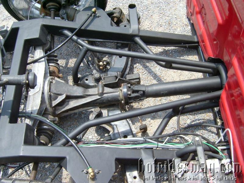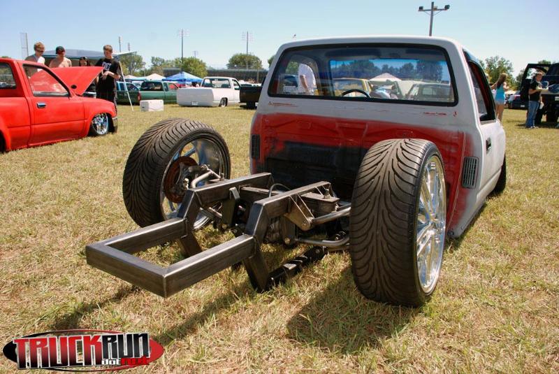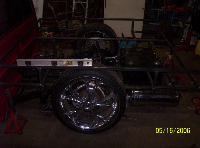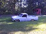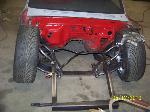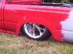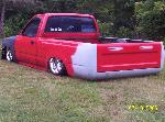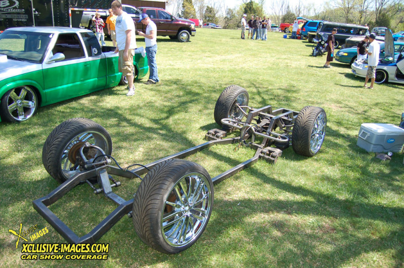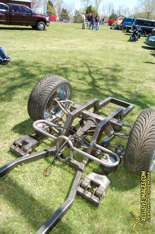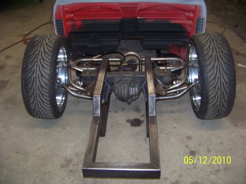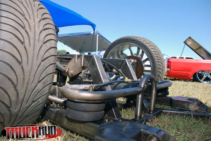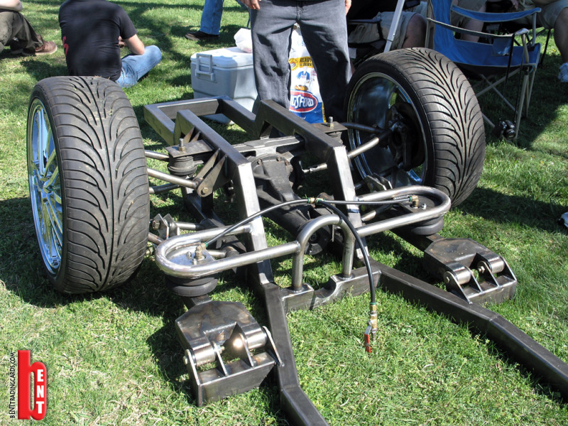 Body dropped 3in.,full frame, tubular upper and lower control arms, modified Mazda Rx7 third member and knuckles to an unequal length controlarm rear end. 3/8 Smc valves, 2600lb bags in the front, 2500lb in the rear. Setup for 20's all four corners. All work done by owner and Hooie's Fab Shop.