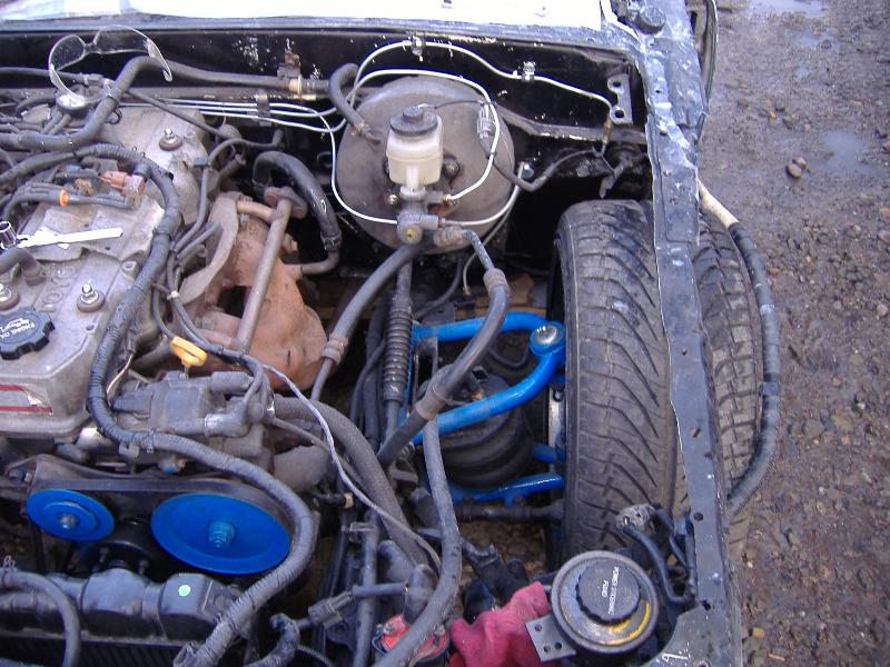 3/8 rubber line, no plastic junk for me and 3/8 valves and fittings, redid the whole air setup front and rear cuz previous owner(s) messed it all up, i guess they didnt know how to research it to do it right? new front bag mounts. upper and lower kustom werks tubular control arms.