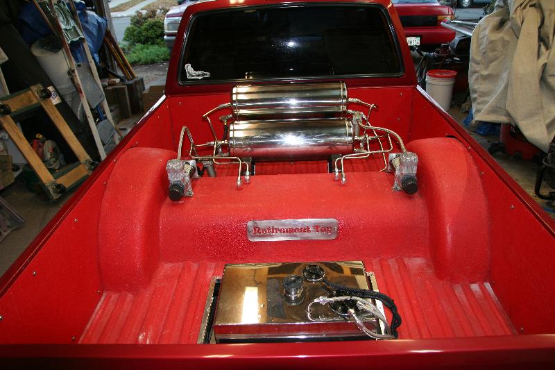 4x4 fenders,bump er/valance w/ billet grill inserts, fiber glass cowled hood,shaved 4-runner doors w/ power windows,locks,& mirrors,shaved gas door,shaved cargo lite w/ LED in it's place,frenched antenna,exhaust set into body panels, & FBI Ca.combo w/ frenched lic box & Suppra lites, tubed inner fenders front & rear, smooth bed panels & removeaable notch cover,stainless fuel tank w/ all braided hoses,stainless air tank w/ stainless hard lines into the bed , duel chrome Viair's 380's w/ K&N filters,train horn behind the front bumper, suicide doors stock hinges & latches, Lokar safety latches @ doors,new paint w/ ghost flames