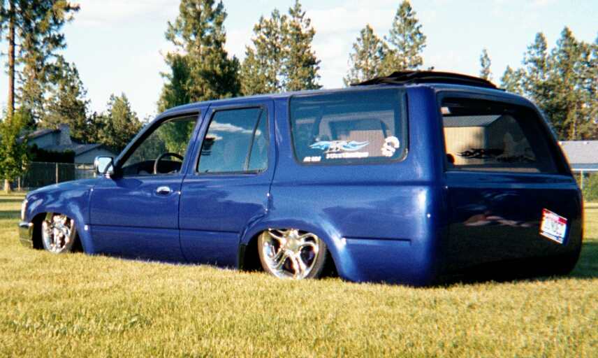 The body work of my IVRunner was all done in my garage, not a shop, so the first order of business was to raise the cab floor a total of three inches to allow IV the marriage of the rocker panels to the ground. To allow clearence IV the motor and to retain a factory appearing hood a Subaru hood scoop was grafted in place. The stock 2WD front fenders were then exchanged IV IVWD units IV better tire clearence. Papa Harry, who helped me with the body work and paint, then completely shaved and reworked the body with a few subtle yet custom touches here and there. The factory front door handles were removed and replaced with a set of Nissan Altima door handles while the rear doors have been void of any such handles. The typical IVRunner rear bumper and rear quarter panels just below the belt line were cut off and replaced with IVWD bed sides and a custom made roll pan. IV a cleaner appearence in the rear the tailgate was shaved and a slanted license plate box with personalized plate (POUNDED) was welded in. The rear tail lights were then shaved and a set of Hi-Tech 6 inch LEDs were installed on the inside of the power tailgate window. Other items that were shaved off the cab include all the emblems, antenna and the fuel door while a huge hole was cut into the roof to allow IV a Street Beat slider to be installed. Once all the body work was done to satisfaction Papa Harry then applied a basecoat of 98 Accura Integra Super Sonic Blue Pearl. To obtain the right depth, he applied several coats of clear and massaged it to a show room shine. Once all the paint work had been completed a chrome IVWD front grill, side marker lights, bumper and lower valance with Billet insert was added to the front. The stock lenses were also replaced with clear units IV an up to date look. I would like to extend thanks to Saturday Joey, Papa Harry and all the Members of the IV EVER LOW Chapter in Idaho ,IV giving their hand in helping me to complete my IVRunner.