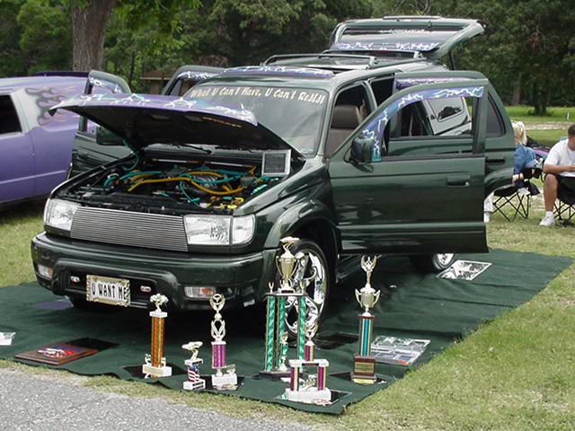 emerald green w/ small gold flakes, matrix mural on hood, airbrushed lightning on visors,neons,strobe lights and tons more!