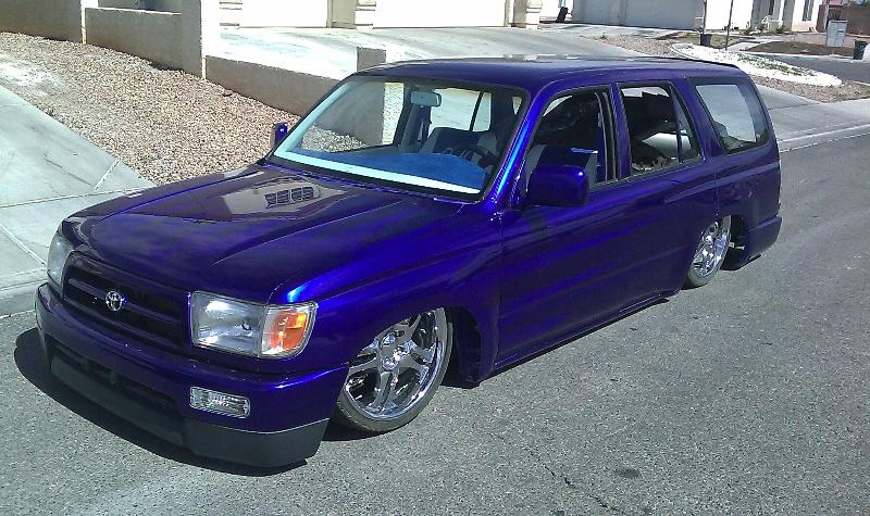 House of Kolor Kandy Burple with silver and white scallop base. Clear front bumper lights, Spyder tail lights. Shaved roof racks, front window washers and wipers, door handles, antenna, rear window washer & wiper & emblem.