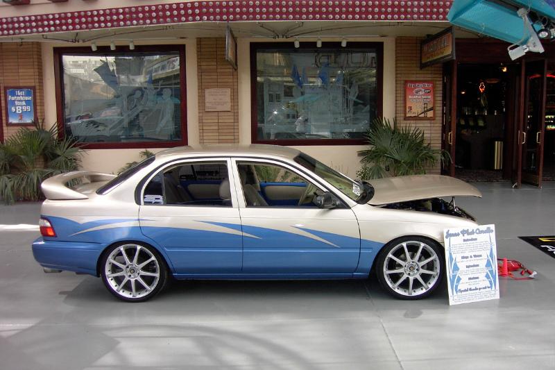 shaved door handles, hood squirters, trunk, trunk key hole, front corner lights. NEO body kit. custom paint using BMW blue and stock Beige with black pinstriping