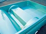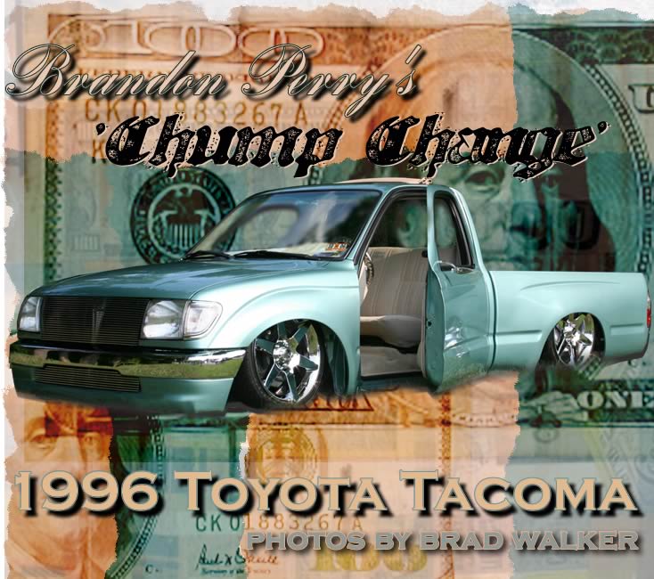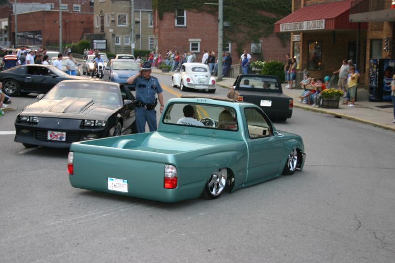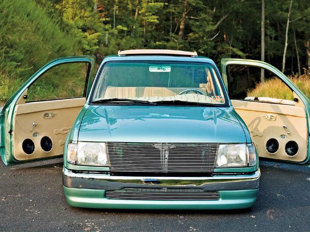 Just repainted AUG 07 custom mix PPG money green. Shaved: handles, gas door, rear cab lines, mirrors, antenna, wiper squirters. Billet mirrors. Molded headlight filler panels to fenders. Molded fenders, Full skin combo. Tan rag top, billet grill, 4 wheel drive chrome bumper, 2 wheel drive valance and billet insert, half cab cut out for stereo, custom one off third brake light, flared bed sides, turn signals moved to side markers, suicide doors with filler panels welded to cab between fender and cab. Full sheet metal bed with radiused rear bed corners and half round metal speaker enclosure.