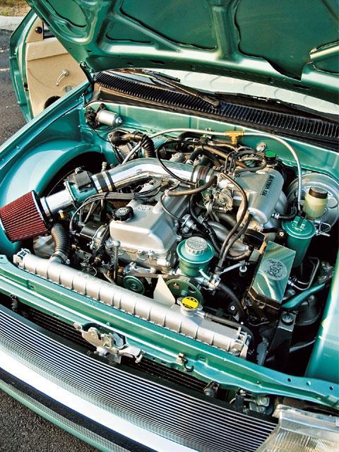 stock 2.4 liter 4 cylinder big block, cold air intake, painted and detailed engine & tranny, relocated 2 optima red top batteries behind front bumper, all engine wiring extended 4 feet. Raised clutch master cylinder. Molded in Front tubs and squared off inner fender area. Sectioned power steering reservoir for hood clearance.