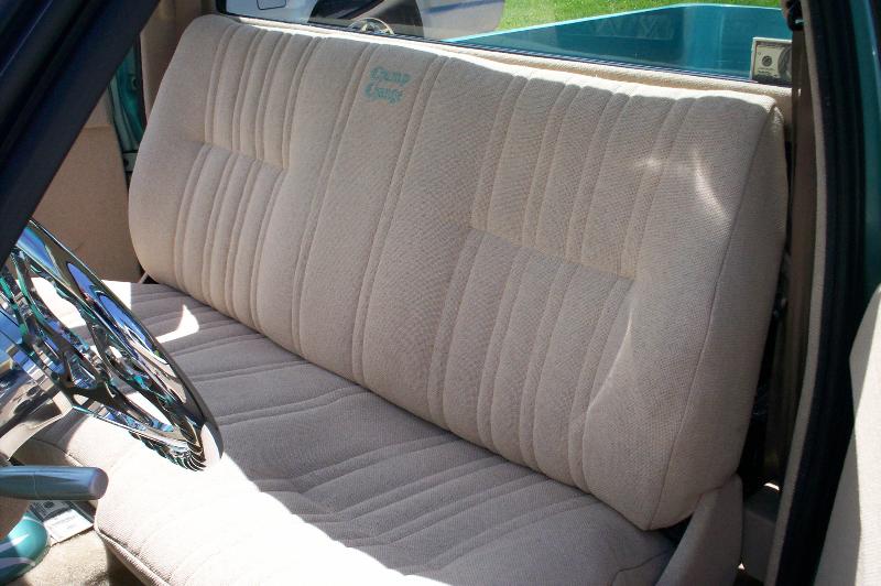 Malibu sand tweed, tons of billet and chrome, one off air gauge mount, embroidered seat, 100 dollar bills and skulls. Fully carpeted with bisquik carpet. Custom fiberglass center console. Hand made door panels that house two sets of audiobahn 6.5 inch 2 way speakers. custom kick panels with 5 and a quarter audiobahn 2 way high's, flamed billet door handles. Raised flames on dash, A-pillers, and door panels. Billet gauge cluster surround, Flamed gauge overlay and all plastic painted to match. Colorado customs billet flamed steering wheel with one off engraved horn button. Custom shortened and bent shifter with hand made skull shift knob.