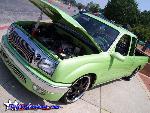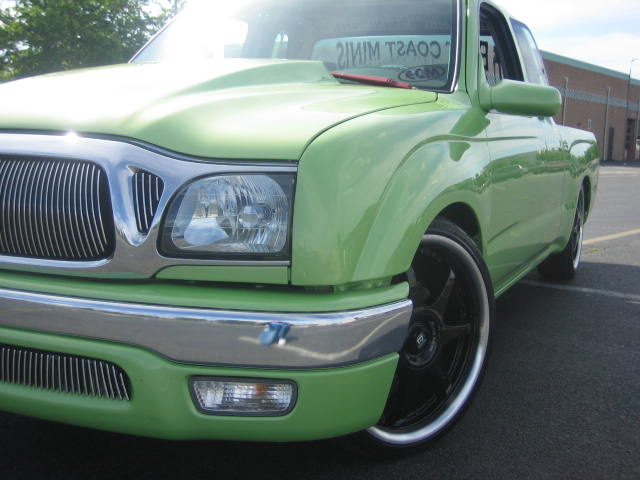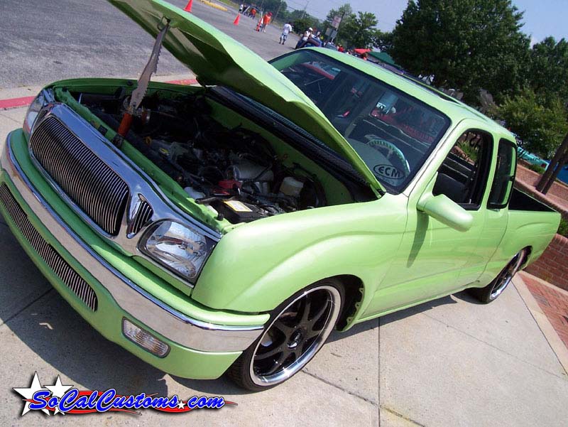 Fully shaved (door handles, corner lights, antenna, third brake light w/ hump, gas door, taillights) CanDo Specialties tailgate/rollpan combo skin w/ frenched license plate box, skinned inside of tailgate and inside the front of the bed, re-located lower body line on the bottom-rear of both sides of the truck, 2005 Tacoma taillight conversion, Church-Steeples.com Cowl Induction Hood, JBM Vertical Billet Grille and Bumper inserts, converted to all clear glass, of course removed all emblems