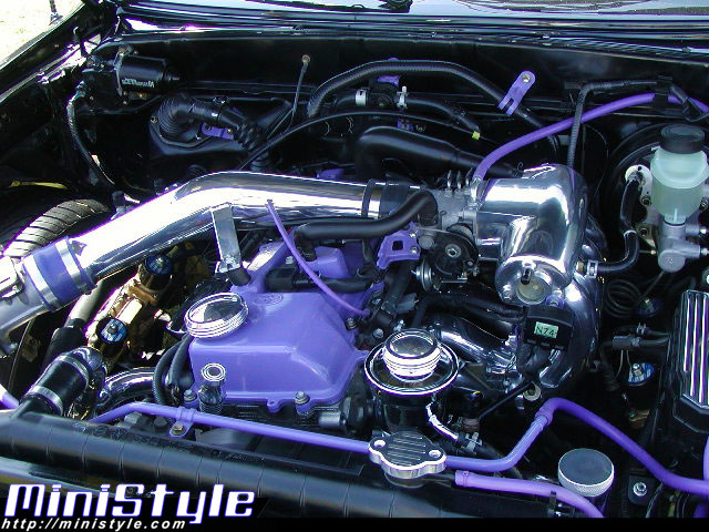 2.4L, Injen Intake, K&N filter, Downey Ceramic Header, Magnaflow Exhaust, Hose Techniques silicone vacuum hoses, Custom fabricated polished aluminum upper & lower radiator hoses, Powder coated valve cover & misc. brackets, Custom billet engine caps/fuse box cover,