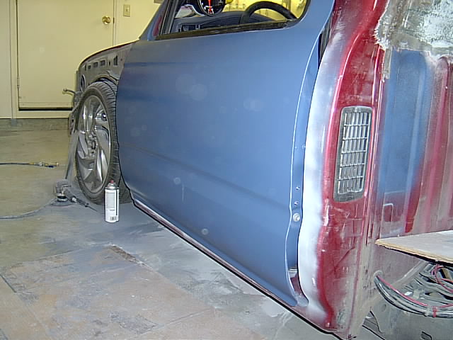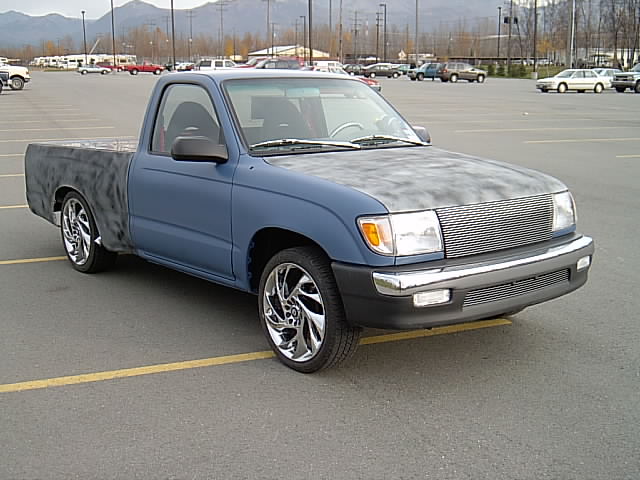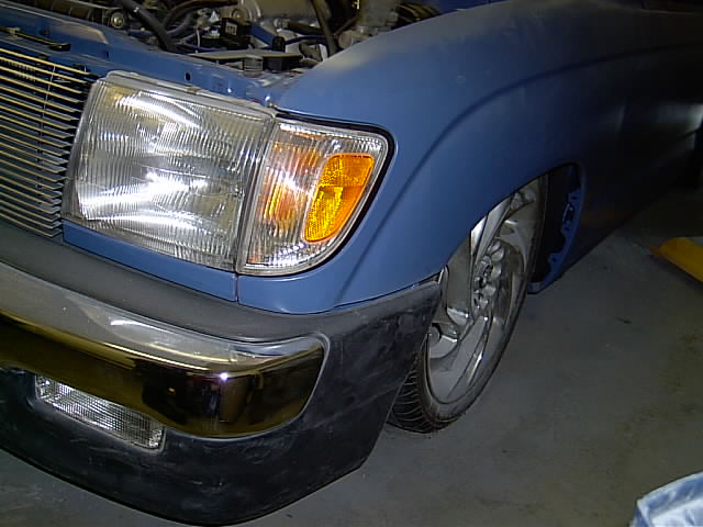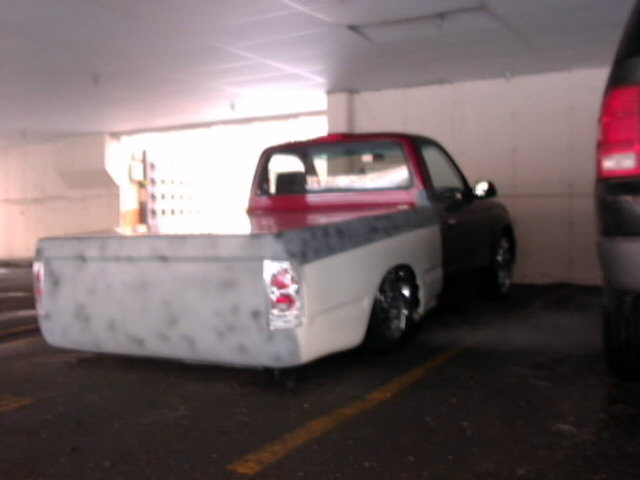 Shaved door handles, hood squirters, antenna hole, gas door. Tailgate skin and rollpan combo. Also a one off aluminum tonneau cover by Elite Concepts in Ft. Walton beach Fl. and custom wheel tubs in the rear. Euro tails, clears in the front bumper and a Lexan rear window with a plate box and lighted billet frame. Chrome windshield wipers and door strikers. Primered blue.