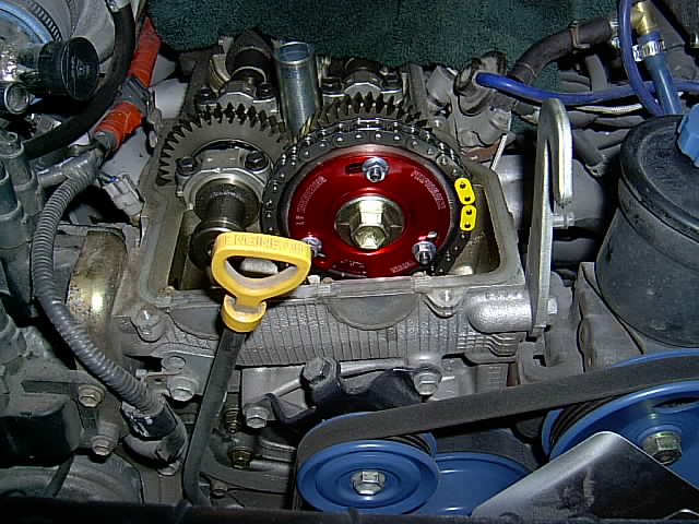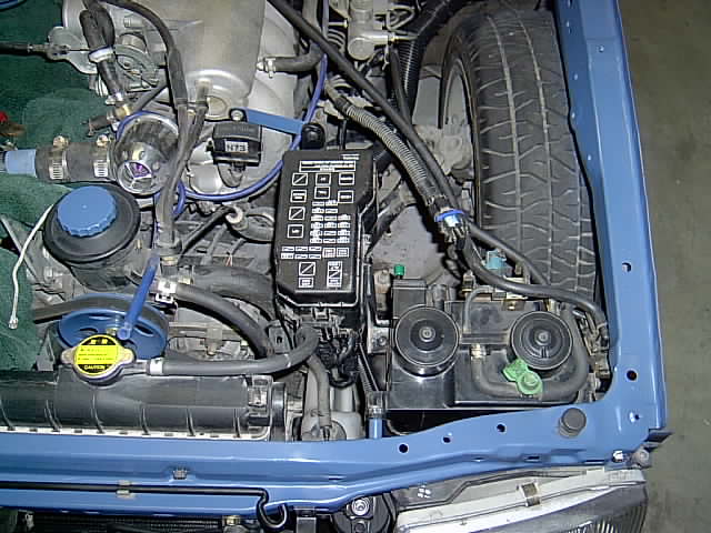 2.4L 4-banger with an E.L. turbo and flowmaster exhaust. Lightened stock flywheel, LC Engneering clutch, short shifter, adjustable timing gear, and flex fan. HKS blow off valve and soon to be installed intercooler. EGR mod, some painted stuff and a powder coated valve cover.