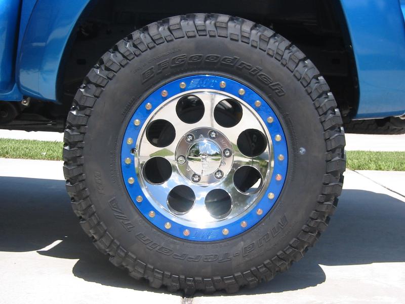 17x9 MT Classic locks with blue bead lock ring with 285/70/17 BFG Mud Terrains
