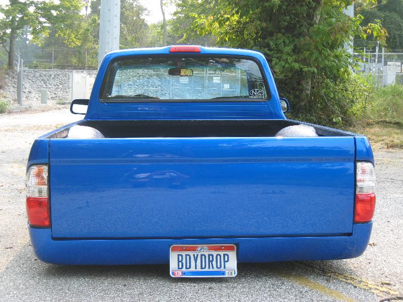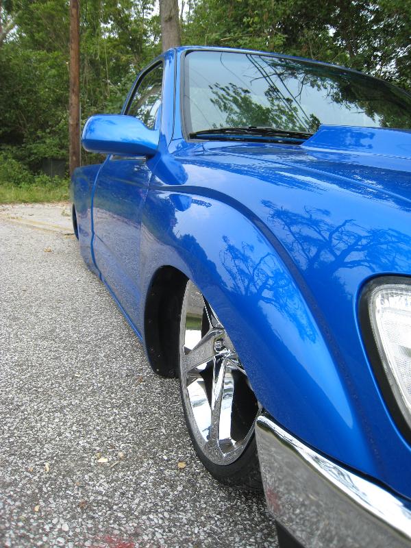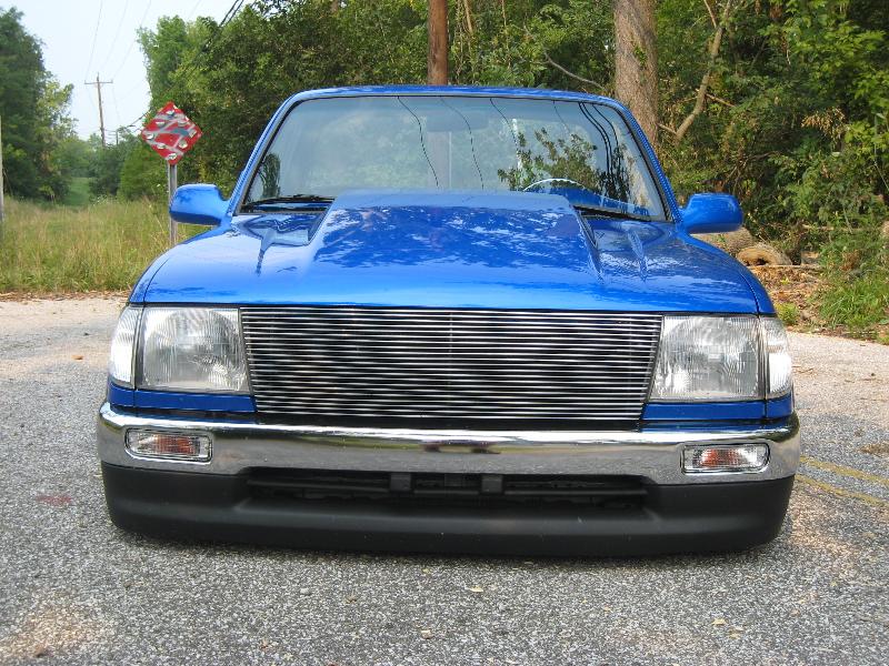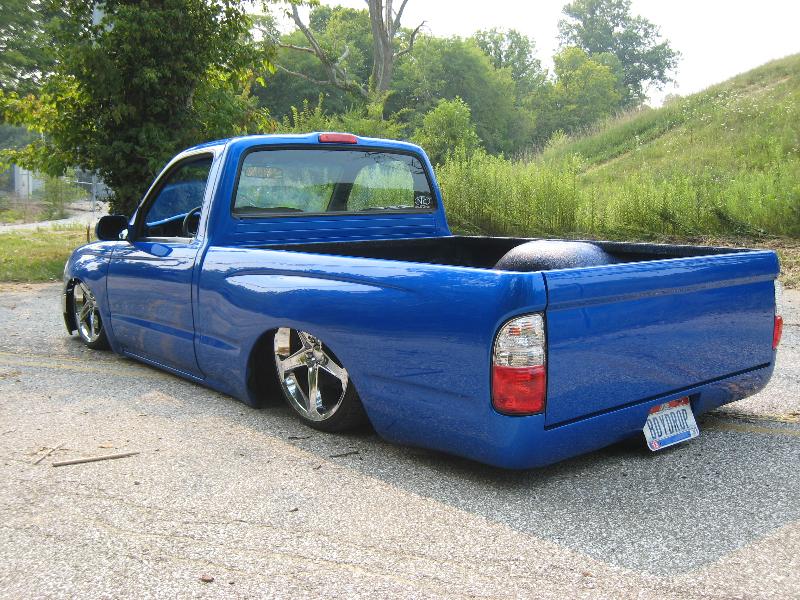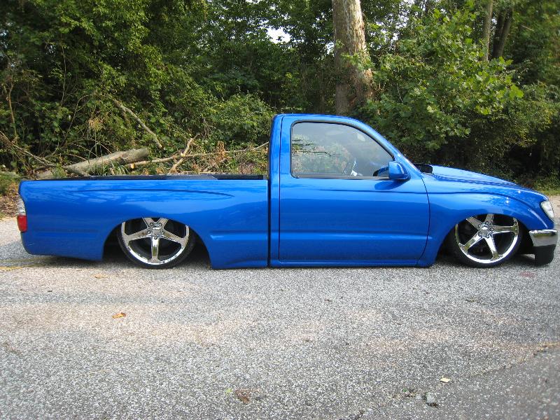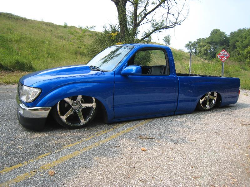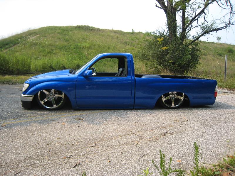 Body Dropped 4 inches, shaved door handles, tailgate handle and gas lid door, 97 Tacoma front bumper, clear corners and bumpers, red and white tail lights, welded in roll pan, cowl induction hood, House of Colors blue paint, billit grille and spray in Bed Liner.