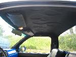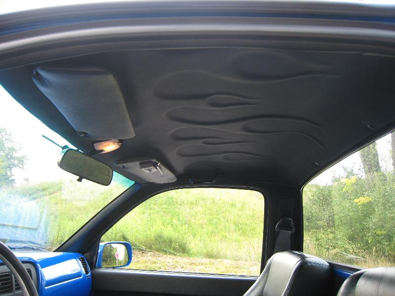 Black leather interior, 2001 Acura Integra Leather seats, flames on door panels and headliner, custom built center console with 8" JL Audio sub on back side of console speaker box, 2 alpine amps behind each seat, painted dash to match truck, Billet Specialties polished steering wheel and a Alpine CD player.