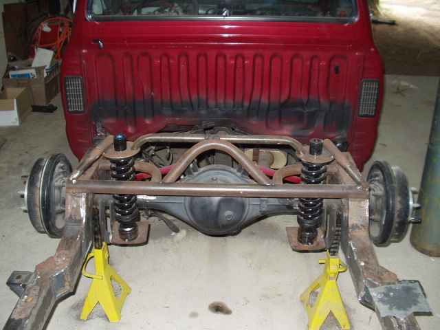 Hydraulic setup, 2 pumps, 10 switches, 8" cyclinders up front and 10" in the rear. Fabricated & boxed rear frame clip, rear end shortend 8"s, triangleated 4-link, complete smoothed and tubbed bed. Tubs fabbed up in the engine compartment.