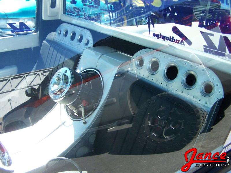 Slicked and painted to match exterior by RF Customs. Jamey Jordan Hand Made Seats (seat brackets by The Kustom Edge). Raceline Billet Steering Wheel.