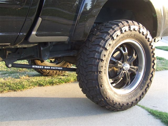 20x8.5" Daatz Black with a brushed aluminum lip wrapped in 37x13.5" Toyo aggressive mudders
