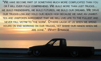 names Cole and i drive a 1986 Nissan 720...im 25 from N.C., my full time job is aircraft structural maintenance AKA metal fab. in the U.S. AirForce, been into the whole mini truckin scene since about 98' and loved every minute of it, anywayz drop me a line...L8