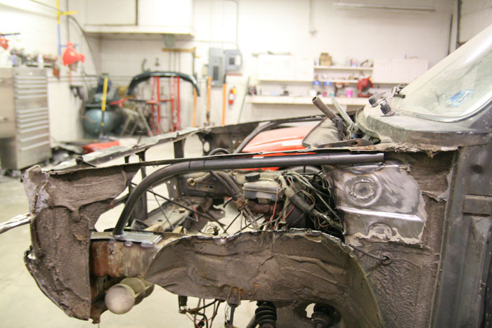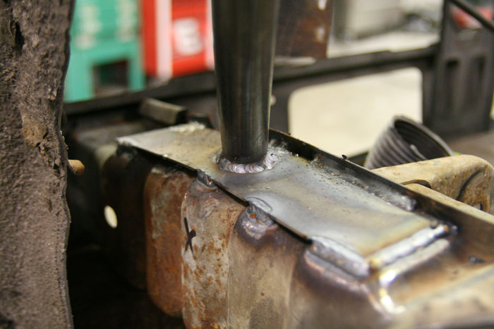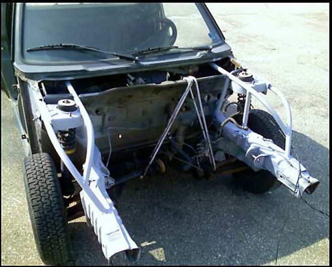 Cut/raised strut towers replaced with tube. Will run air struts (but don't have them yet) Rear axle will be narrowed, stub axles raised, and linked to lay on the rear. probably run behind and below the axle bags