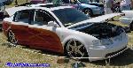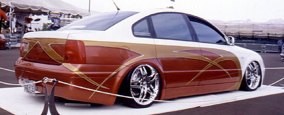 fully shaved doors emblems rear trunk , body lines front and rear bumpers. volvo and mercedes colors on graphics. white rag top.